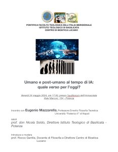 Si invitano, a nome del Direttore prof. don Nicola Soldo, tutti i docenti e gli studenti a questo convegno venerdì 24 maggio alle ore 17.00 presso l'auditorium dell'Immacolata a Potenza con il prof. Eugenio Mazzarella (Università degli Studi di Napoli "Federico II") sull'Intelligenza Artificiale che chiude l'anno accademico e che…