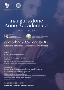 Martedì 29 ottobre 2024 alle ore 18.00 presso l'Auditorium dell'Immacolata, viale Marconi 104 a Potenza, ci sarà l'inaugurazione dell'A.A. 2024/2025 dell'Istituto Teologico di Basilicata Potenza (ITB) e dell'ISSR "Mons. Pecci" di Matera, tenuta dal Moderatore dell'ITB, S.E. Mons. Davide Carbonaro, alla presenza del Nunzio Apostolico per l'Italia e la Repubblica…