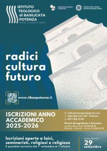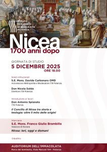 L’Istituto Teologico di Basilicata “Mons. Giuseppe Vairo” di Potenza è lieto di invitare la S.V. alla Giornata di Studio “Nicea – 1700 anni dopo”, che si terrà venerdì 5 dicembre 2025 alle ore 18.00 presso l’Auditorium dell’Immacolata, Parco del Seminario, Viale Marconi 104, Potenza. Questa giornata accademica di studio, aperta…