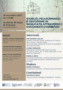 Si segnala questo interessante convegno presso l'Archivio di Stato di Potenza, in via Nazario Sauro, dal titolo "Giubilei, pellegrinaggi e devozione in Basilicata attraverso documenti d'archivio" che si terrà venerdì 28 novembre 2025 alle ore 17.00.