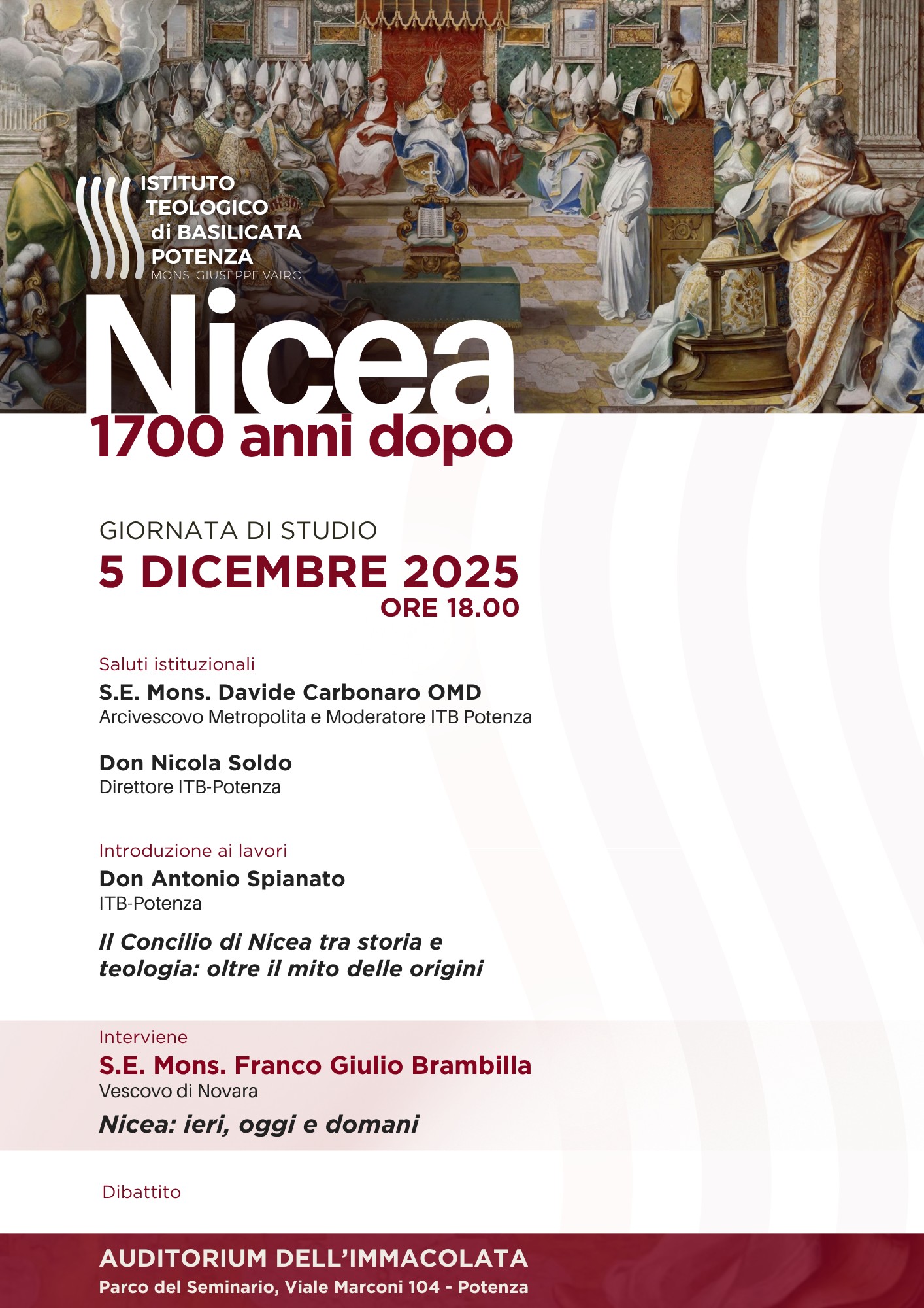 L’Istituto Teologico di Basilicata “Mons. Giuseppe Vairo” di Potenza è lieto di invitare la S.V. alla Giornata di Studio “Nicea – 1700 anni dopo”, che si terrà venerdì 5 dicembre 2025 alle ore 18.00 presso l’Auditorium dell’Immacolata, Parco del Seminario, Viale Marconi 104, Potenza. Questa giornata accademica di studio, aperta a docenti e studenti, intende offrire una riflessione approfondita sul primo Concilio della Storia della Chiesa: il Concilio di Nicea del 325, evento fondativo della fede cristiana, nel suo significato storico, teologico e attuale. Dopo i saluti istituzionali di S.E. Mons. Davide Carbonaro e del Direttore il prof. don Nicola Soldo, introdurrà i lavori il prof. don Antonio Spianato, con un intervento storico-sistematico sull’evento di Nicea. Seguirà la relazione di S.E. Mons. Franco Giulio Brambilla, Vescovo di Novara, sul tema “Nicea: ieri, oggi e domani”. L’illustre relatore vanta un curriculum di alto profilo: già Ordinario di Teologia Dogmatica presso la Facoltà di Teologia di Milano, ne è stato Preside. È stato Vicepresidente della Conferenza Episcopale Italiana, membro della Commissione Episcopale per la Dottrina della Fede e della Catechesi della CEI, è stato Vescovo Ausiliare di Milano e inoltre Presidente del Comitato per gli Studi Superiori di Teologia e Scienze Religiose. Centinaia i titoli della sua bibliografia con monografie, curatele e saggi su Riviste nazionali e internazionali. L’incontro si concluderà con un dibattito aperto al pubblico. Sarà un’occasione preziosa per rileggere la fede delle origini con lo sguardo di oggi, in un dialogo tra memoria, pensiero e attualità, nella luce della comunione ecclesiale. Nell’ultima parte si può aggiungere qualche domanda: Tutta la comunità accademica e tutti gli interessati a riscoprire la forza e l’attualità di un evento che ha segnato in modo decisivo la storia della fede cristiana è invitata. Cosa ha da dirci Nicea ancora oggi? È possibile andare oltre il mito delle origini per una rilettura più reale e vitale, capace di allargare gli orizzonti della nostra comprensione teologica, spirituale e pastorale?